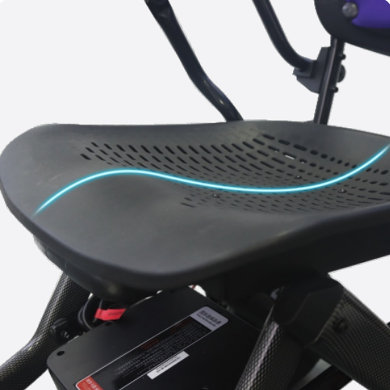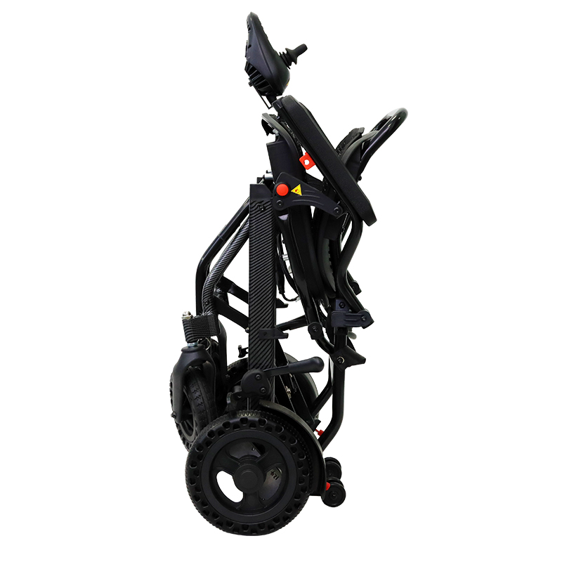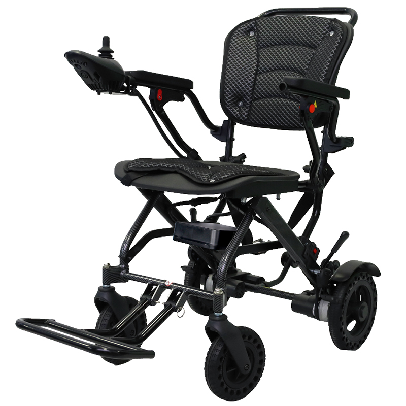 1:Aluminum alloy with carbon fiber Spray surface treatment 2:Ergonomic seat and backrest,with removable pad 3:PU leather flip back armrest 4:7" honeycomb front wheel 5:10" honeycomb rear wheel 6:With Anti roll wheel 7:2*180W/24V motor brush motor 8:6A-20A lithium battery(Quick detachable)